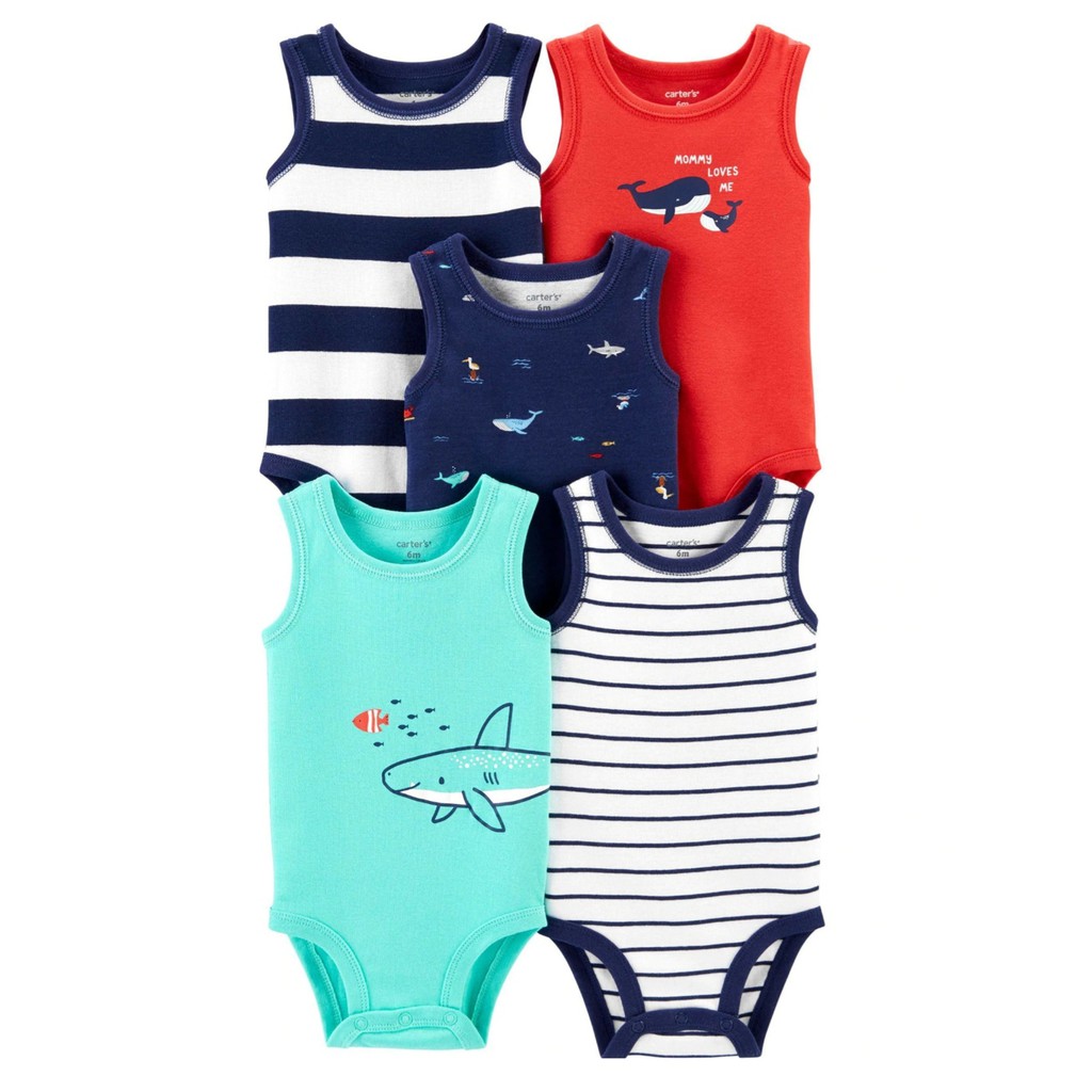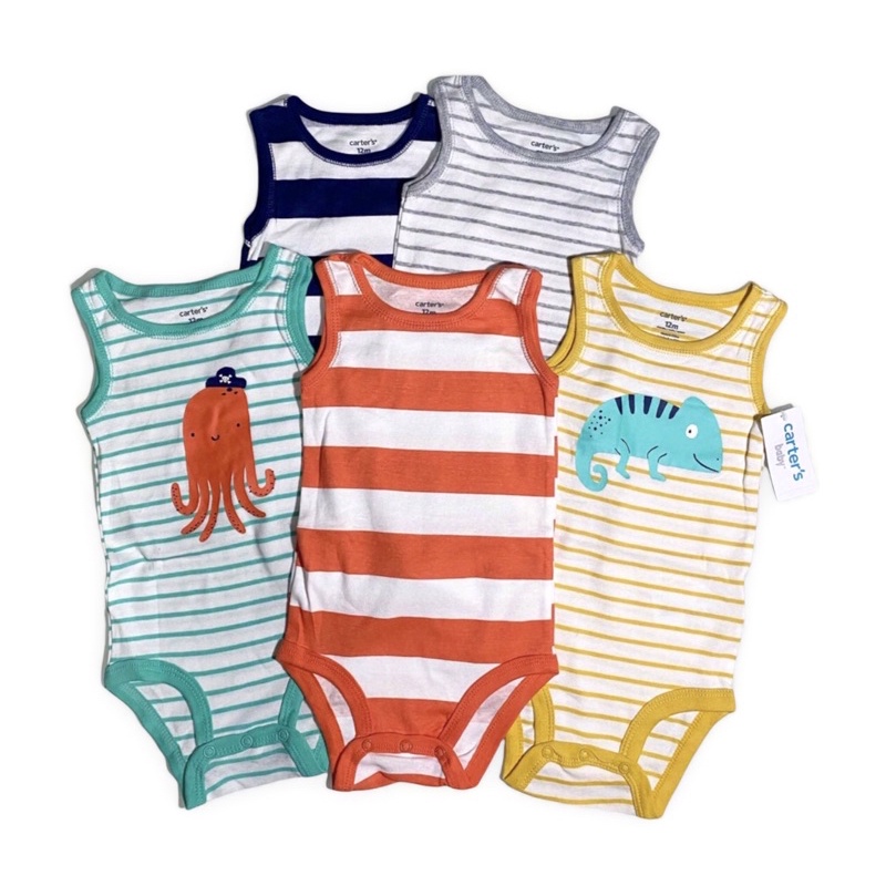 Conjunto 5 peças body carters masculinos listrados regata. Kit body carter's masculino regata polvo. Você e seu bebê irão se encantar pelas cores e estampas dessas peças.À vista no cartão ou boleto marcas carter's;
